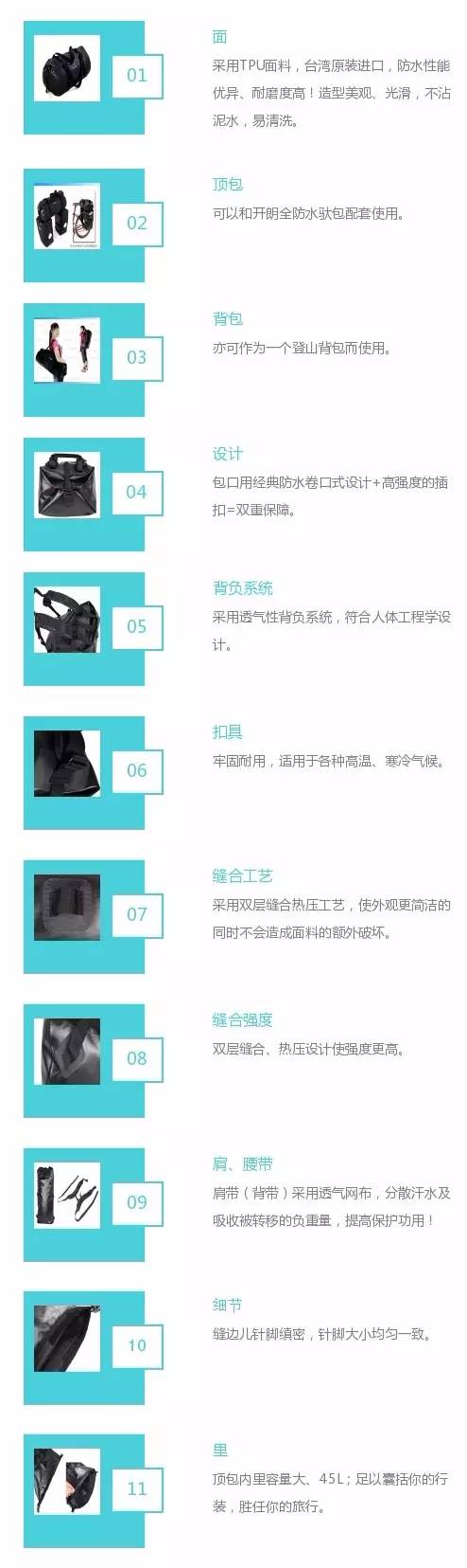 采用台湾尼龙840DTPU面料和UTX扣具,高频焊接、热压缝合使包具完全防水,包口用经典防水卷口式设计,无需使用防雨罩,取放物品更快捷,可抵御极度严寒。