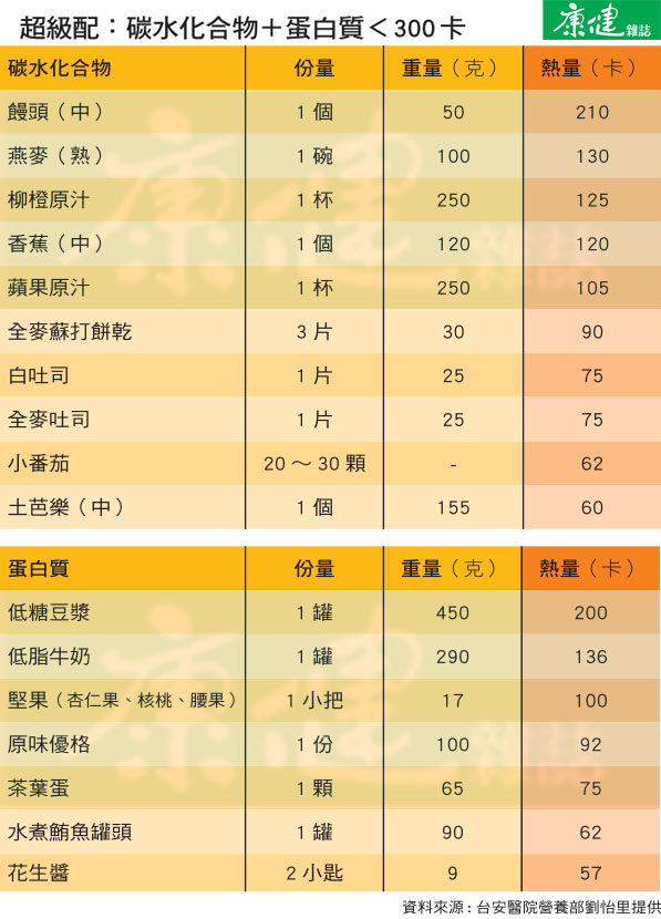 例如香蕉搭配一杯低脂牛奶,即为碳水化合物与蛋白质的均衡分配,热量只有约250卡。其他像地瓜+1颗水煮蛋、几颗杏仁果+低糖豆浆,或是一份马铃薯沙拉三明治,也都是可以考虑的选择。