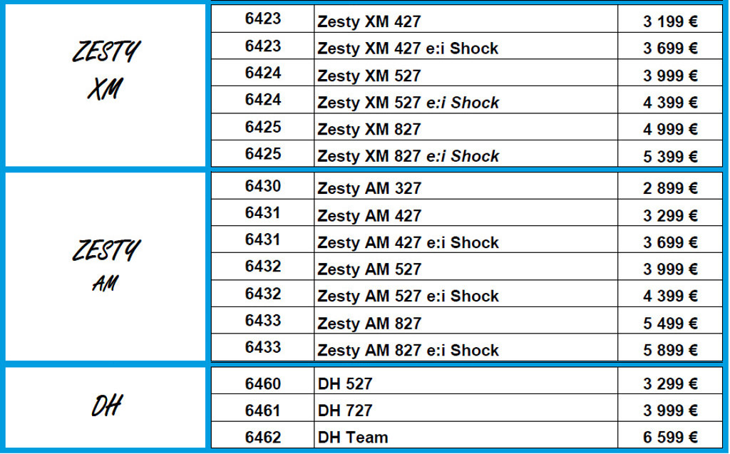 Zesty是Lapierre最重要的一台车。它跨及长行程林道车领域,也有轻量化车身与电控Horst-Link后避震系统,使它在许多高等级的全山地/林道竞赛中,享有表现优异的盛名。2016的Zesty经过全新设计:超炫造型碳纤材质车架、加长前三角、整体角度更趴、适合更激烈骑乘的零件选配。有相同车架两种等级选择,150mm行程AM,具有较长行程,更大外胎,更重度零件选配。另外是120mm行程长度的XM,整体重量轻,目标是偏向XC骑乘风格的使用者。
