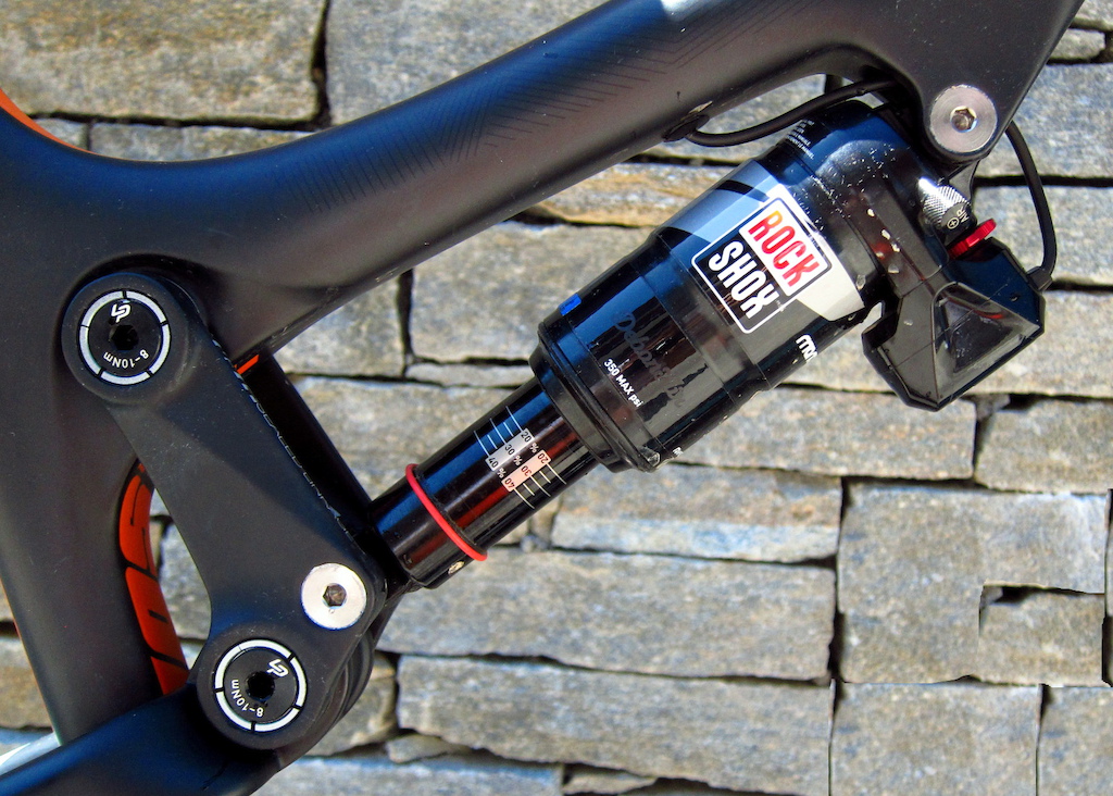 新款Zesty车架上的后避震锁点,由下管移至上管,轭型推桿也消失了。Ei器伺服器位于Rockshox Monarch Relay后避震器顶端下方。