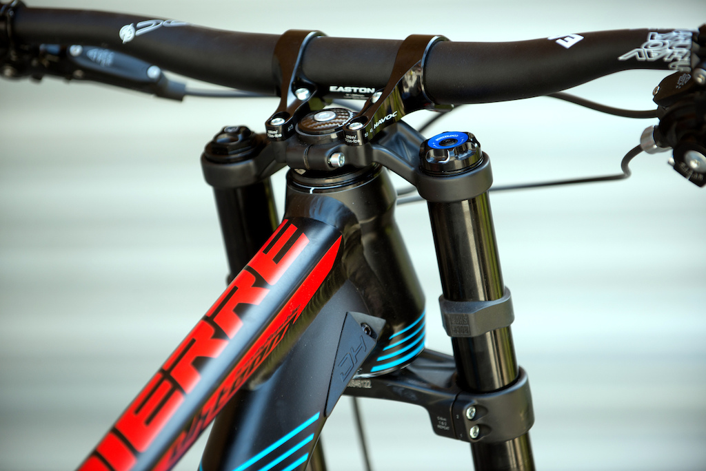 Easton直锁式龙头与橡胶前叉防撞块。Lapierre使用铝合金抽管组成这台车的骨架,这让它的售价明显有优势。有三种等级可选择,从6299欧元的Team等级到3299欧元的DH 527。Falco Mille photo