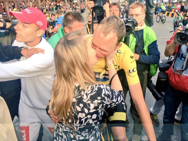 ▲回到终点后,Froome赛后马上与妻子一同庆贺。