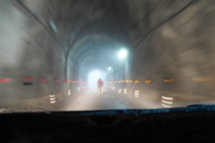 台湾有些高山路线会有隧道,这些隧道几乎都是单线、潮溼、阴暗,读者们骑车时一定要先注意到路线上是否有这种隧道,像是大雪山的横岭山隧道就是其中之一,进入隧道时一定要先开启前后灯以及注意交通管制人员的指示。像是这天除了路面潮溼之外,海拔越高雾气越浓厚,连经过隧道时也有一层层雾气。