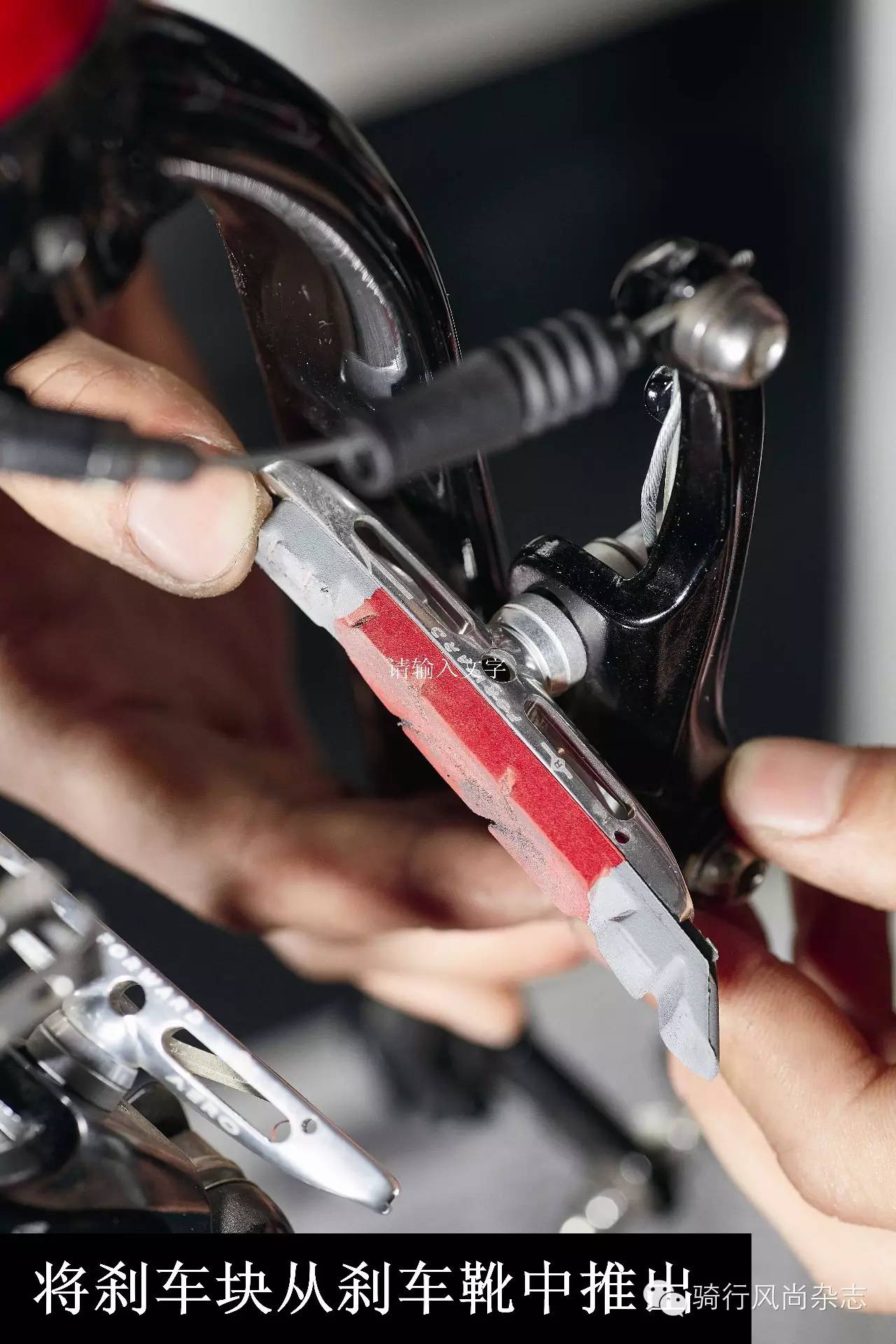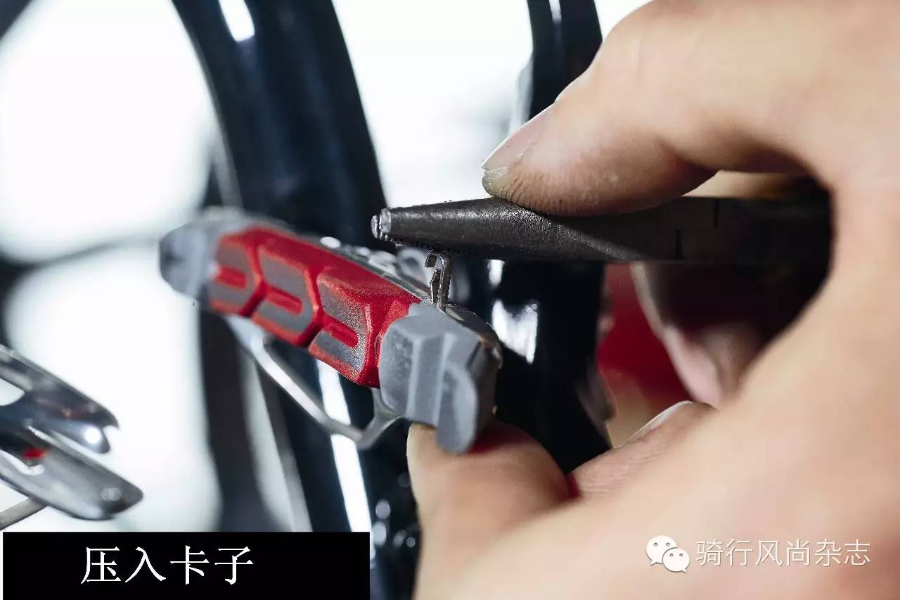 3拆下刹车块一般V刹固定刹车块的方式都是以一个卡子固定,现在主流的SHIMANO和SRAM也均采用这种方式。用钳子将卡子夹出,便可将刹车块从刹车靴中推出。