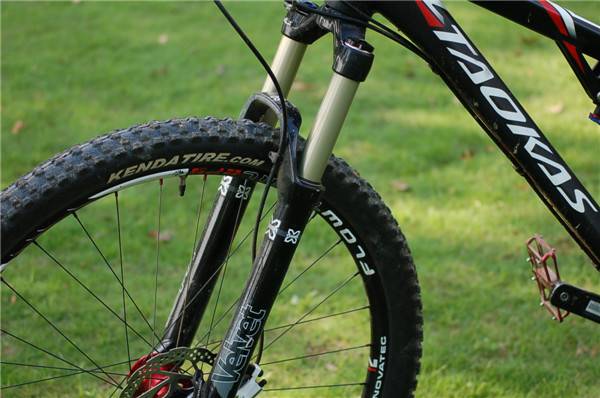 前叉也采用野宝旗下的Velvet RL,这款前叉润度和回弹方面都属一流,和fox比并不逊色。无论大小震动都能很好吸收。但和后避震比,则没有那么优秀的踩踏平台支持。如果你站立踩踏加速,会发现后避震纹丝不动,但前叉如果不锁死就会随着身体起伏。如果这款前叉配有类似后避震的踩踏平台,那么这款整车可以作为是一款出色的xc战车,或许能在复杂地形的长途耐力赛比赛中占有一席之地。