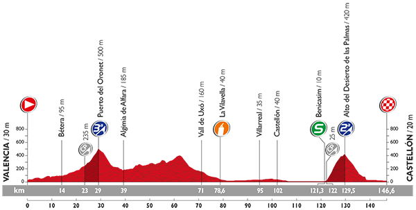 环西第一週的末场赛事,属于过渡站性质,因此把终点设在平路。但想参与冲刺的选手可得先克服Alto del Desierto de las Palmas这个二级坡才行,否则一切都是空谈。