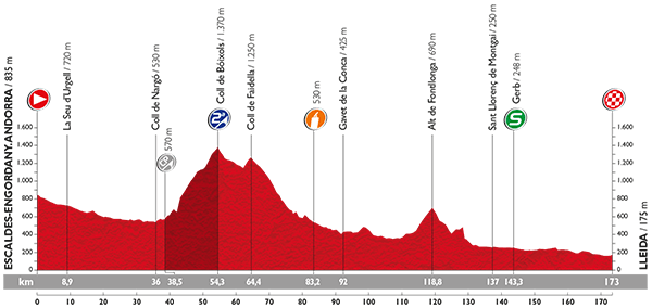 多坡的赛事又一站。一共7个分级坡为今年环西之最,而且越到后头越是困难。终点前的一级坡跟超级坡扮演着关键地位。由于隔日是第二休息日,因此落后的GC选手极有可能放手一搏。