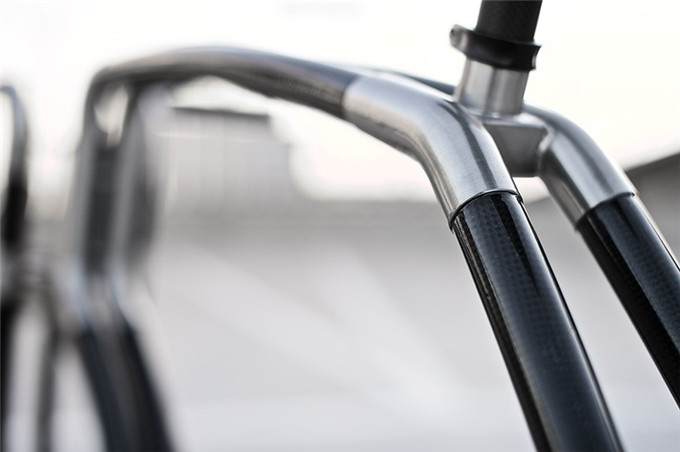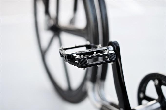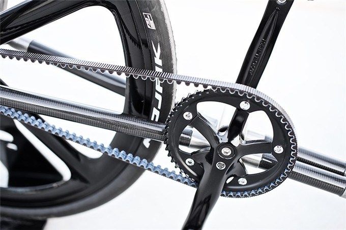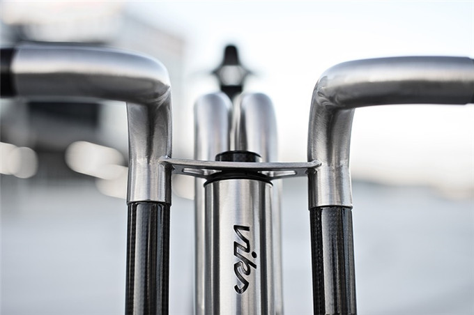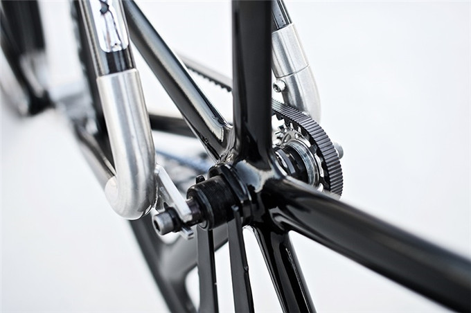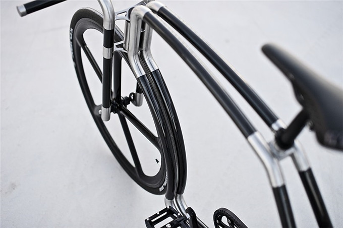 虽然采用双管车架,但是这辆“Viks”整车全重只有4千克!另还配备了gates牌碳传动带、为弯腰骑行设计的后轮轂,以及与之相匹配的 aerospoke 牌碳纤维轮副。