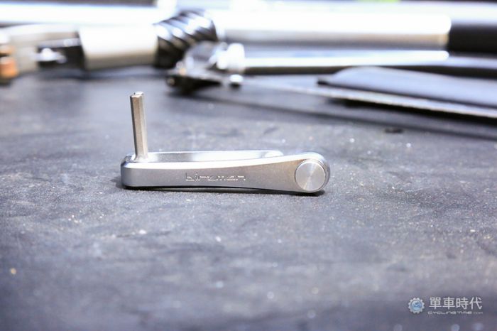 Birzman推出了随身轻便型的扭力扳手,如果车友们在外面骑乘时需要调整到这些部位,就非常的方便了,看这非常精致的按钮造型,所有扭力的祕密就藏在这里。读者可以注意到的是这颗按钮里已经设定好了扭力值(5N-m),将六角扳手打开至90度位置,此时六角扳手与按钮的力距就等效于5N-m的扭力值。当我们在使用时拇指放在按钮上,听到清脆的「咔」声代表扭力已经达到上限了。